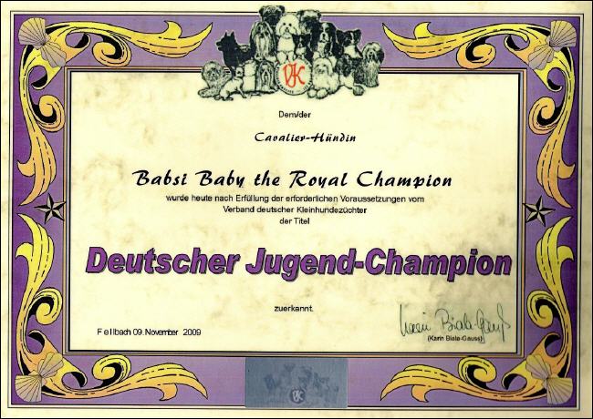Dt. Jugendchampion 4 x V1, JCAC, 1 x V2, R-JCAC, 2 x V1 und CAC, VDH-CAC, 2 x Beste Hündin, 1 x JBIS 3 (von 18 Junghunden) Landesjugendsieger Berlin-Brandenburg 2009 5 x vv1 von 5 Ausstellungen |
